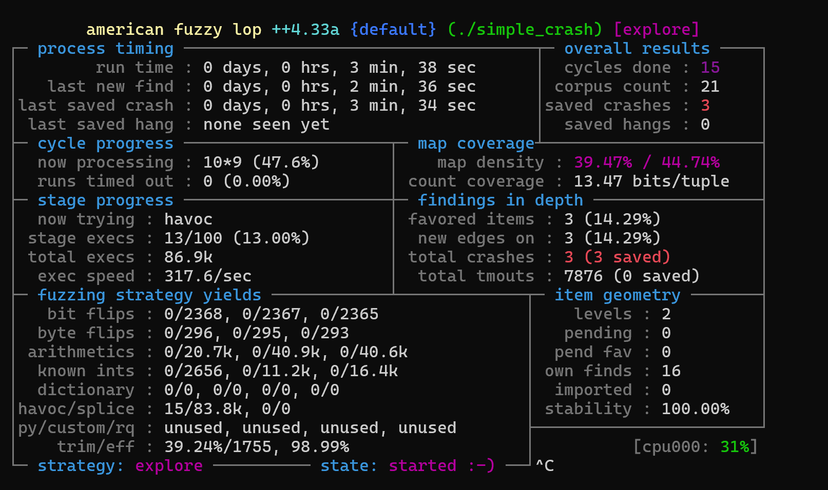 得到了三个崩溃,可以ctrl + c中断运行了,并得到了out文件↓