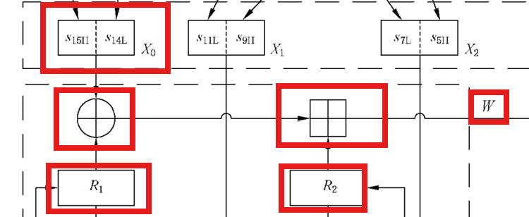 设计者的解决方案是:引入 R1、R2这两个“记忆单元”,“记住”当前的 密钥流状态,让它们两加入到生成新的密钥流过程中。意思是:在 LFSR的第 n轮的计算中,此时 R1、R2它们的状态是第 n-1轮计算的结果,并且,由于迭代,当前的 R1、R2包括了过去所有轮次的“历史信息”,更准确地说,此时 LFSR的第 n轮的计算,与前 n-1轮都有关系