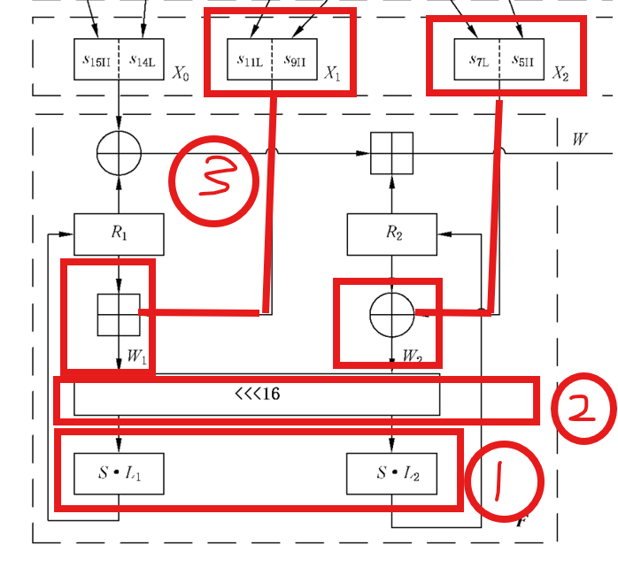 而 比特重组返回的结果,4个32位字 X0, X1, X2, X3中,只有 X0, X1, X2 被送入 非线性函数F 当中,而 X3将会与 非线性函数F得到的 w进行异或,得到我们用来进行 LFSR的初始模式的 u,这样设计即实现了非线性,又保证了效率